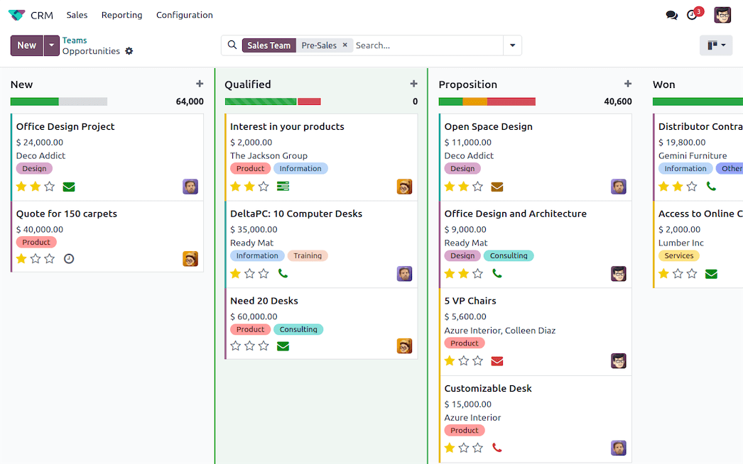 Odoo's effective quote management system can help you get rid of time-consuming tasks. You can concentrate on closing deals by using drag-and-drop features to manage your sales pipeline and sending quotes with a few clicks.